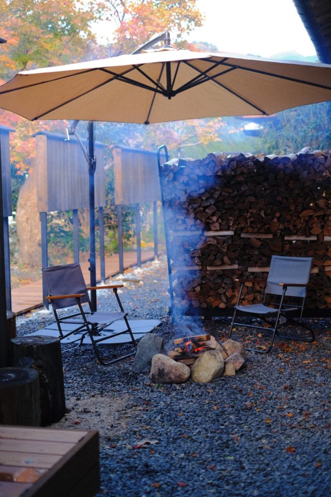 キャンプ場のように焚き火場まで移動する必要がなく、お部屋から直接焚き火スペースにアクセス可能。荷物の管理も楽々です。